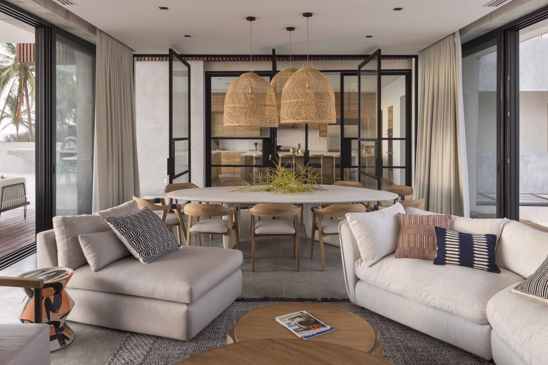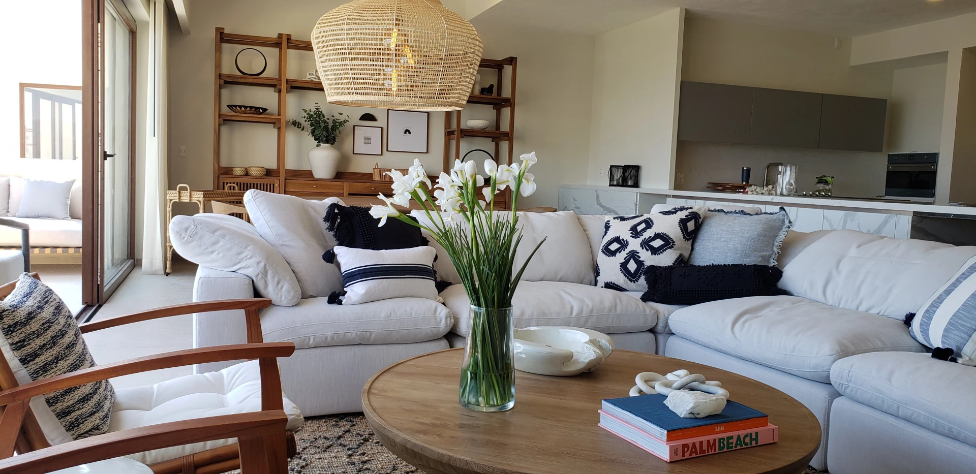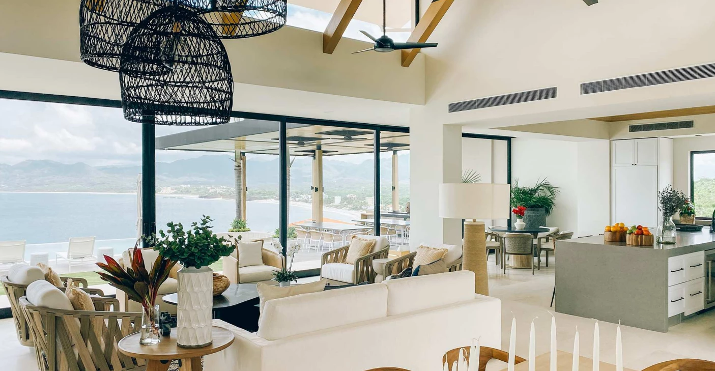 Para los proyectos de playa, hemos elegido materiales y elementos que reflejan la frescura y naturalidad del paisaje costero. Predominan las maderas claras, que evocan la calidez y la autenticidad de los espacios junto al mar, y las fibras naturales como el lino y el ratán, que aportan ligereza y permiten que el ambiente se sienta ventilado y luminoso. Los tonos suaves, como los blancos, cremas y arenas, son la base de cada proyecto sin olvidarnos de los toques de color que acompañan con sutileza, creando un espacio donde la luz natural es protagonista y se respira una sensación de amplitud. En cada rincón, buscamos que los elementos de diseño se integren de forma orgánica con el entorno, ofreciendo comodidad sin perder esa frescura característica de un lugar frente al mar.