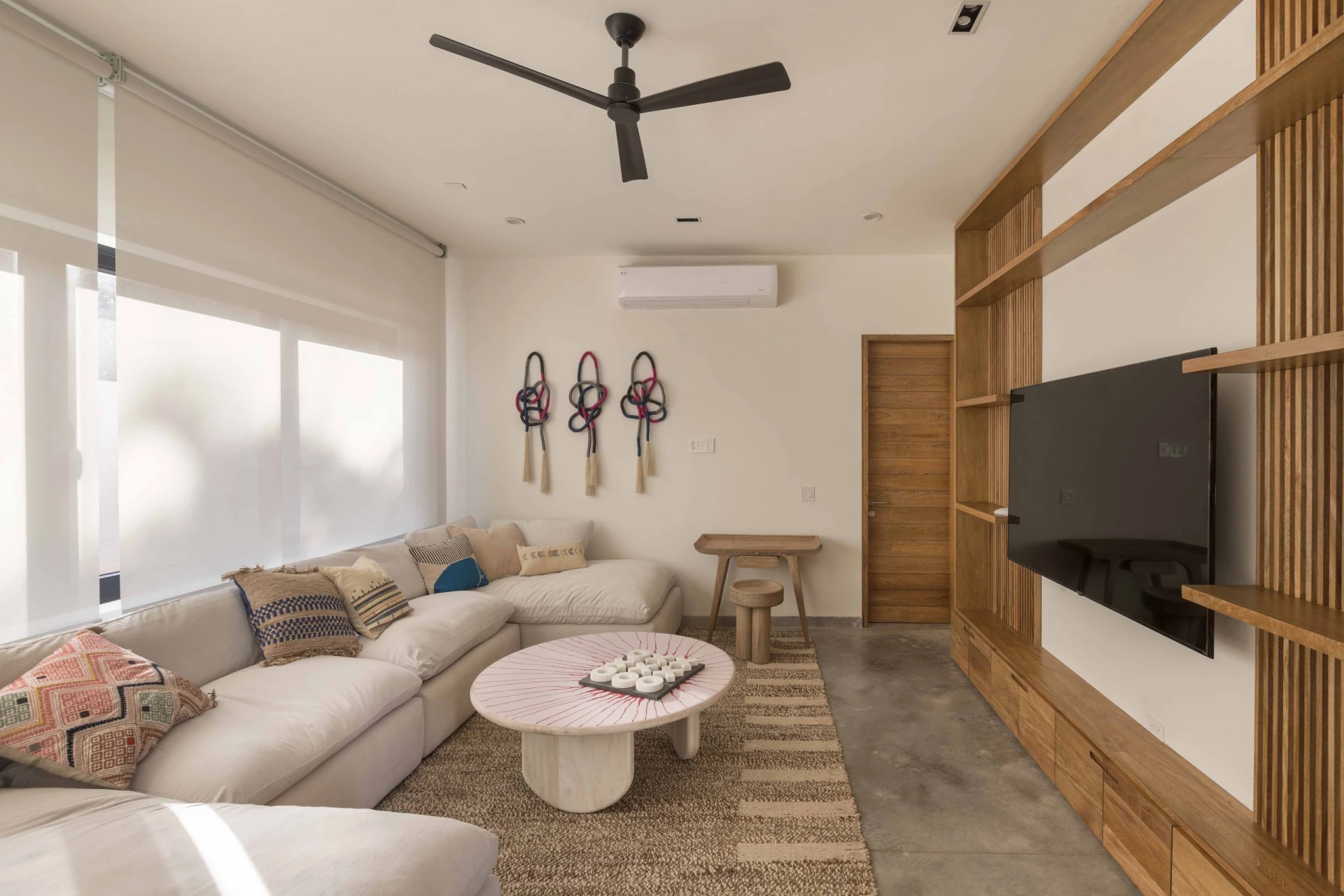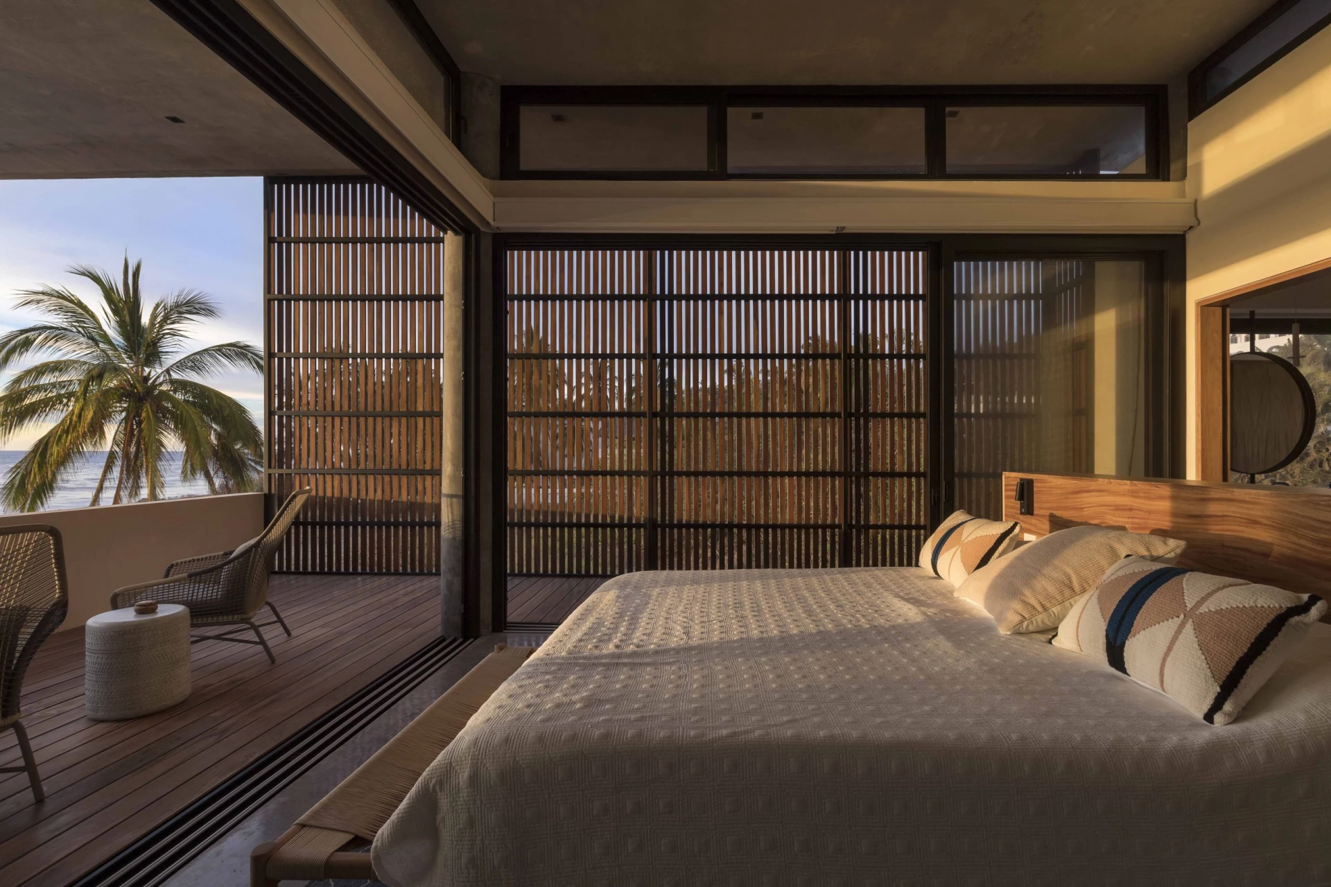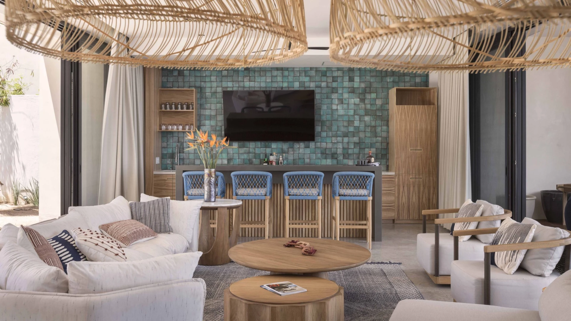 La paleta de materiales se mantuvo natural y suave: textiles claros, maderas cálidas y fibras que aportan textura sin competir con la luz. Los marcos negros y los grandes ventanales dan estructura y profundidad, mientras que el mobiliario de líneas relajadas invita a quedarse, conversar y bajar el ritmo. Cada elemento se eligió para resistir el clima costero y, al mismo tiempo, conservar una estética elegante y atemporal, donde lo sencillo se siente cuidadosamente pensado.